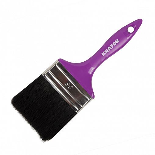 Плоская кисть KRAFOR с чёрной щетиной. Ручка — пластиковая, с отверстием для подвешивания. Щетина смешанная, закреплена в металлической обойме.
